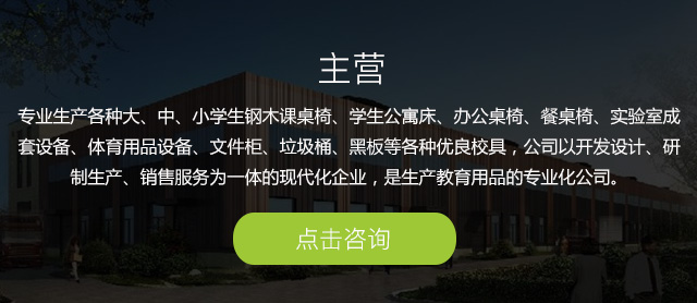 本公司生产各种大、中、小学生钢木课桌椅、学生公寓床、办公桌椅、餐桌椅、实验室成套设备、体育用品设备、文件柜、垃圾桶、黑板等各种优良校具,公司以开发设计、研制生产、销售服务为一体的现代化企业,是生产教育用品的公司。成为国内大、中、小学的优先选择产品。企业通过了ISO9......